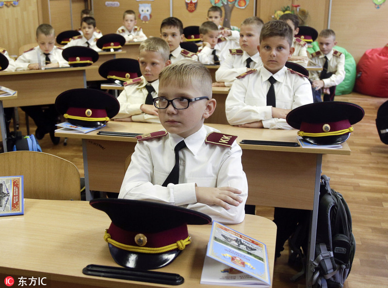 当地时间2018年9月3日,乌克兰基辅,当地一所少年军校迎来“知识日”,即开学首日,小学员身穿军装返校上课。乌克兰的“知识日”标志着新学年的开始。