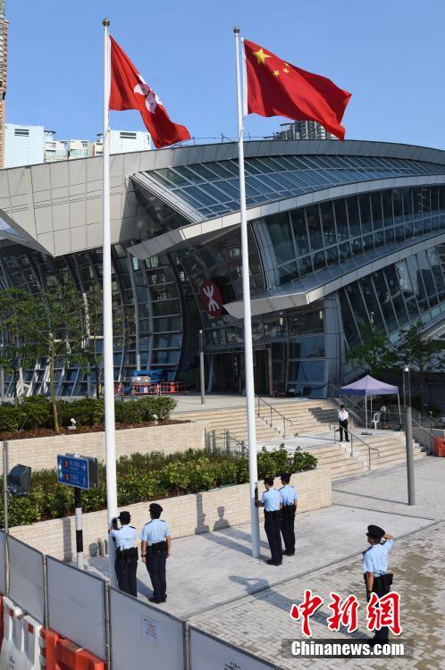 9月5日早上,一个香港警员小队正在广深港高铁西九龙站进行升国旗及区旗仪式。高铁西九龙站由9月4日起,每天定时有警员进行升、降旗仪式。 中新社记者 麦尚旻 摄