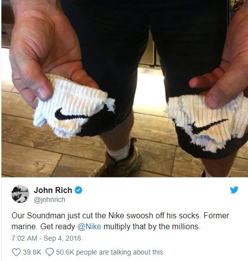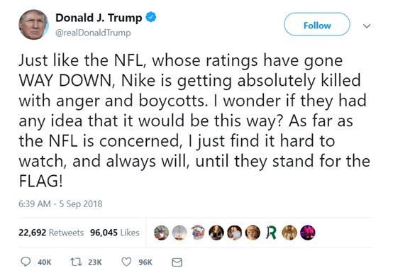 昨天,特朗普本人就亲自发帖称,美国爱国群众的“怒火”已经“几乎干翻”(absolutely killed)了耐克公司,就像美国橄榄球大联盟因为不爱国而在收视率上遭到的清算一样。