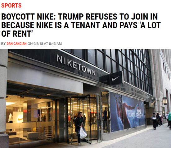 更滑稽的是,虽然特朗普在不断发帖煽动美国人去抵制耐克,他自己却并没有加入抵制的行列,因为耐克公司的一家旗舰店坐落在特朗普所拥有的地皮上,给他贡献了不少租金……