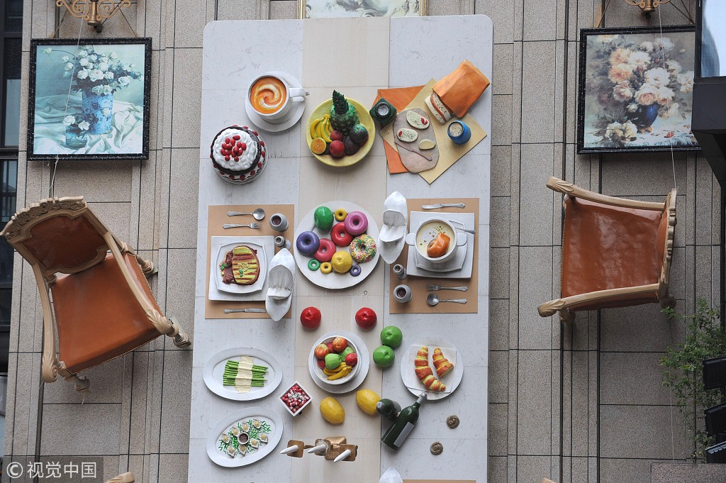 2018年9月4日,武汉街头,一张超大的西式餐桌现身楼房外墙,长约四层楼的餐桌上,按比例放大的食物、餐具、烛台等一应俱全,令人食欲大增。