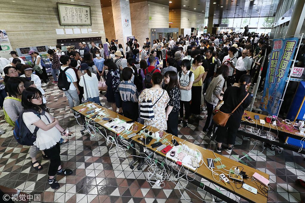 当地时间2018年9月6日,日本北海道札幌,民众聚集北海道政府大楼给手机充电。