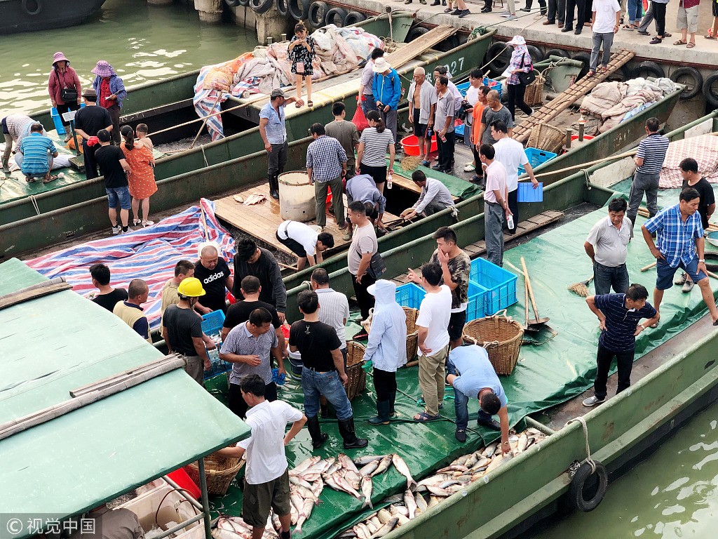 2018年9月6日,浙江湖州,太湖大型渔具高踏网开捕首日,长兴新塘大桥边的鱼市上,一艘艘满载鱼儿的渔船吸引了不少顾客,特别是开着大型货车的鱼贩子,他们早已等候在岸边许久,等待渔民归来收购鲜鱼。每年9月是太湖开捕的季节,经过几个月封湖禁渔的日子,一场关于太湖湖鲜的饕餮盛宴由拉开了序幕。随着一网网鲜活鱼虾跃出水面,太湖渔民们迎来了期盼已久的“丰收年”。