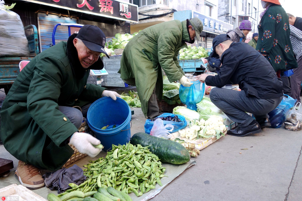 黑河市大早市上卖菜的农民穿着棉军大衣。