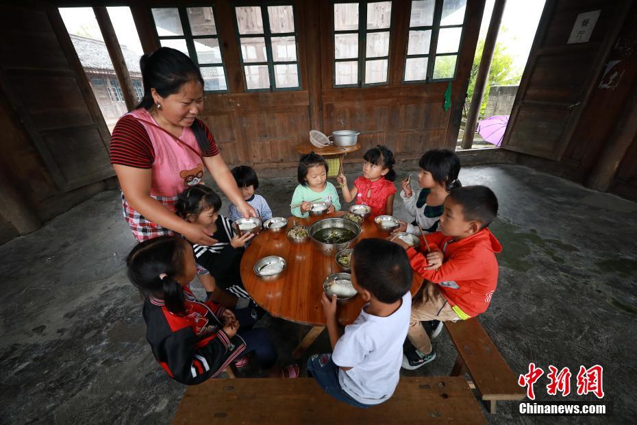 9月7日,贵州省丹寨县排调镇党干村教学点,杨昌军的妻子李丽给孩子们盛饭。 中新社发 黄晓海 摄