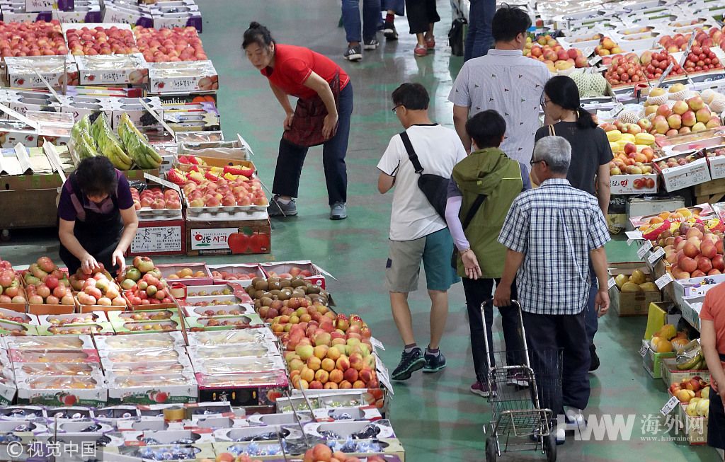 当地时间2018年9月9日,韩国釜山,在釜山市釜田市场,采购中秋祭祀、节庆用品的顾客摩肩擦踵。