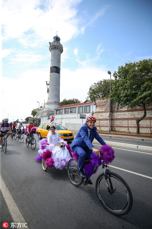 当地时间2018年9月9日,土耳其伊斯坦布尔,当地一名新郎骑着用自行车改装成的婚车迎娶自己的新娘。