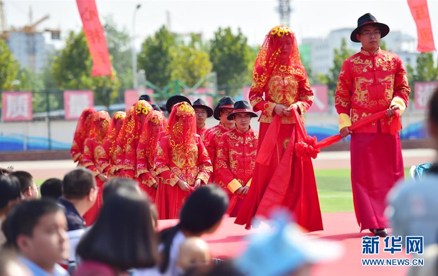 9月9月,在石家庄石门实验学校的校园集体婚礼上,新郎用红绸牵着新娘。