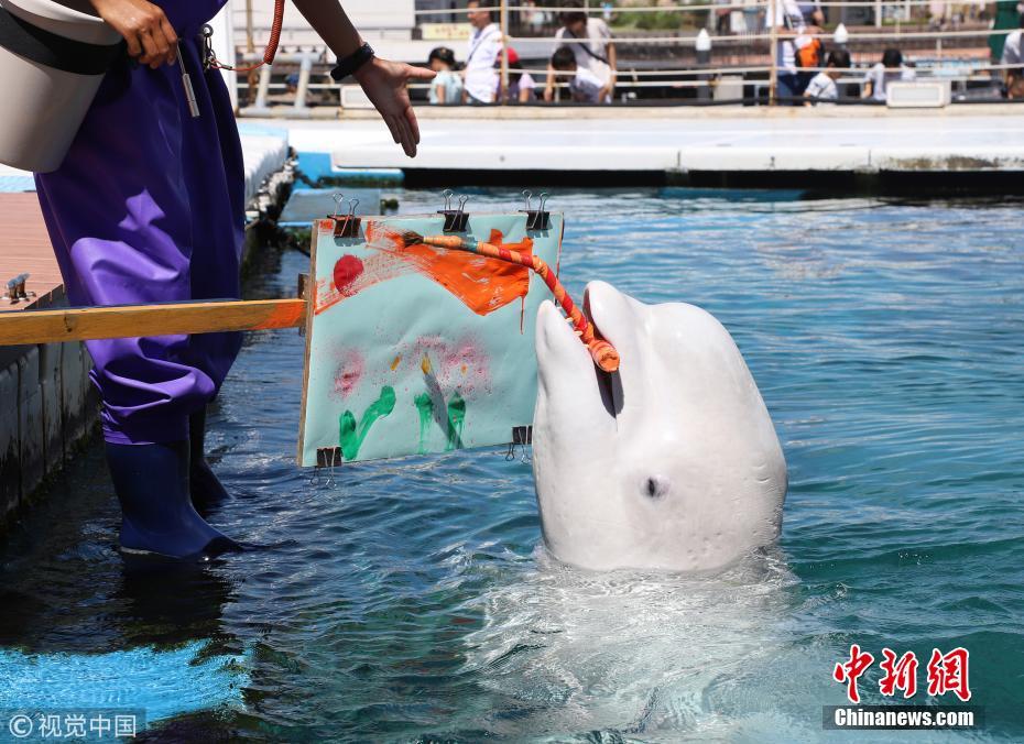 当地时间2018年9月9日,日本横滨,八景岛海洋乐园水族馆举办白鲸艺术活动,一头白鲸叼着画笔作画有模有样。