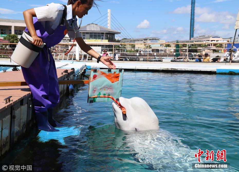 当地时间2018年9月9日,日本横滨,八景岛海洋乐园水族馆举办白鲸艺术活动,一头白鲸叼着画笔作画有模有样。