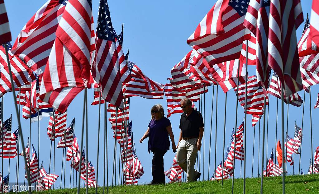 当地时间2018年9月10日,美国加利福尼亚马里布,游客在佩珀丁大学参观“国旗飘扬”展览。该展览每年举行,其展出的2997面国旗是为了纪念2001年9月11日“911”恐怖袭击的受害者。
