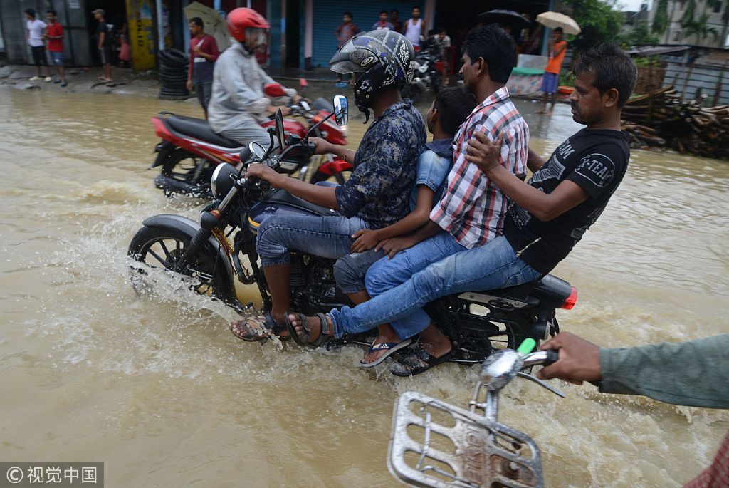当地时间2018年9月10日,印度西里古里,暴雨致Panchanai河水位上涨,周围洪水泛滥,影响居民生活和出行。持续的降雨已造成了西里古里和周边地区发生洪水和山体滑坡。