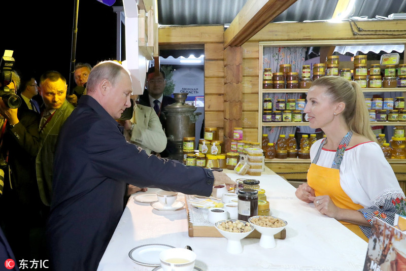当地时间2018年9月11日,俄罗斯符拉迪沃斯托克,普京出席第四届东方经济论坛,参观远东街头展览,期间化身大厨制作起俄罗斯煎饼。