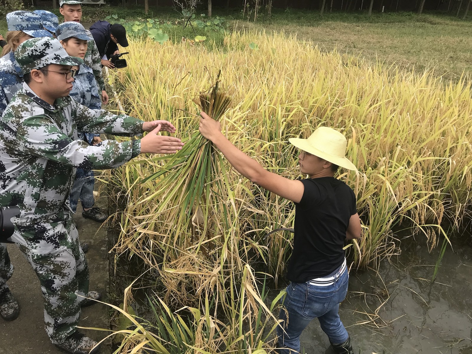 今年新入学的新生从军训开始,就要一边军训,一边收割水稻。(视觉中国)