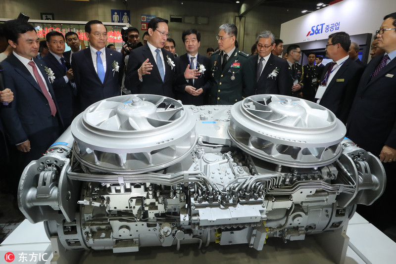 当地时间2018年9月12日,韩国京畿道高阳市,2018大韩民国防卫产业展在当地韩国国际会展中心(KINTEX)举行,韩国国防部长官宋永武到场参观。