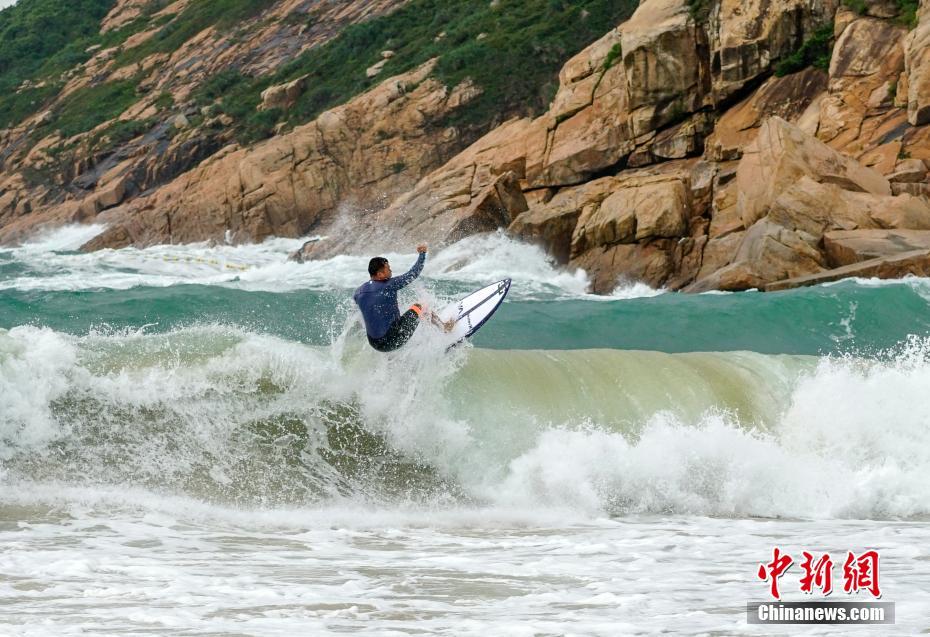 9月12日,位于香港岛东部的石澳泳滩浪高风急,但仍有众多冲浪爱好者前来冲浪。 中新社记者 张炜 摄