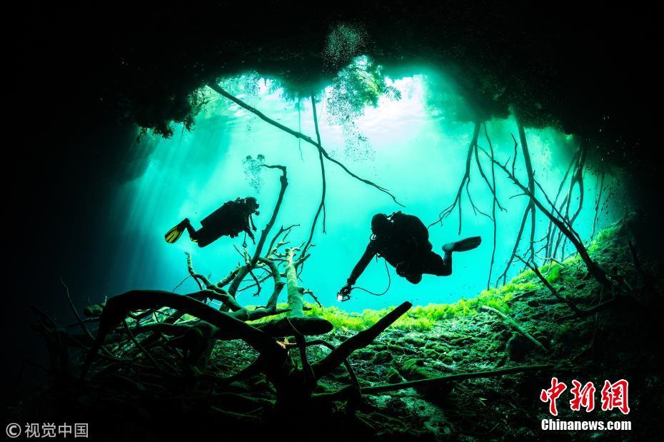 2018年9月13日讯 阳光从一个水下洞穴的顶部洞口照入,潜水员在一柱阳光中游泳,画面神秘而美丽。洞穴内的水非常清澈,光线可以到达50米深的地方,洞穴的其余部分完全处于黑暗之中,是没有视力的“盲鱼”的家园。这些令人震惊的照片是由28岁的日本潜水教练Hiromasa Araki拍摄的,他和朋友在墨西哥坎昆进行了一次潜水,并将此次体验描述为“就像在天堂一样”。