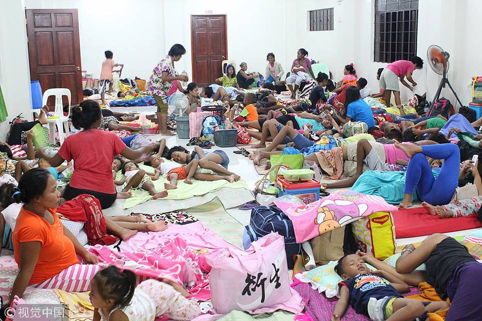 当地时间2018年9月13日,菲律宾贡扎加,超强台风“山竹”即将来袭,当地居民纷纷躲进疏散中心。