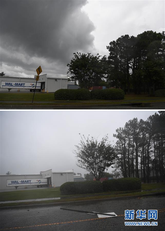 拼版照片:上图为9月13日在美国北卡罗来纳州威尔明顿市拍摄的小雨中的路标和树木;下图为9月14日在美国北卡罗来纳州威尔明顿市拍摄的暴风雨中的路标和树木。 新华社记者刘杰摄