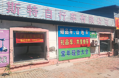 天津市武清区王庆坨镇曾以生产共享单车闻名,如今镇上店面内已难觅共享单车的踪影。图为路边贴着共享单车标语的自行车店,店内空无一人,橱窗玻璃上贴着“厂房出租”的字样。 本报记者 孔德晨摄