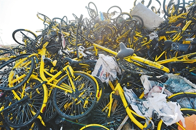 各大城市共享单车投放过多影响了城市交通。图为杭州的一片空地上,由于长时间的存放,大批共享单车与垃圾堆放在一起,加大了处理这些单车的难度。 龙 巍摄(人民视觉)
