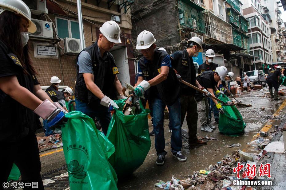 2018年9月17日,澳门,台风灾区清理工作进行中。据澳门气象局17日早上5点公告显示,“山竹”正远离澳门,集结在澳门以西约430公里,风力减弱,今日4点改挂为3号风球,黑色风暴潮警告也已于16日晚上11点取消。
