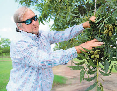 哈德逊说,美国的贸易保护主义举措让他感到忧心和愤怒,他担心自己过去20年的心血可能毁于一旦。图为7月10日,在美国佐治亚州奥西拉,山核桃种植户兰迪·哈德逊在自己的种植园中展示未成熟的山核桃。新华社记者 杨承霖摄