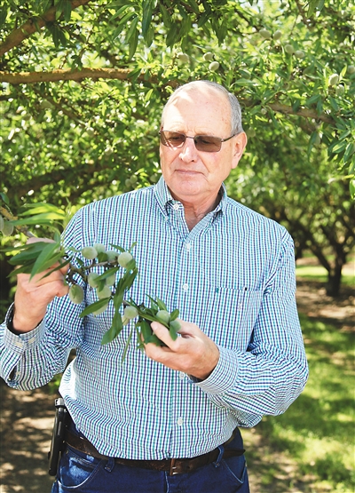 4月25日,巴旦木种植业者菲彭热情地带着记者参观了他与四位合伙人共同拥有的位于加州莫德斯托地区的巴旦木种植园和加工厂。根据加州食品和农业部门的数据,该州2016年巴旦木出口额达45亿美元,是该州第一大农业出口产品。“我们家已经四代种植巴旦木,我一辈子都在这个行业工作,我们视中国市场为巨大机遇,”菲彭对记者说,“回头看看过去5年,中国市场没有令我们失望。”图为巴旦木种植业者菲彭展示初步成形的巴旦木果实。 新华社记者 高 山摄