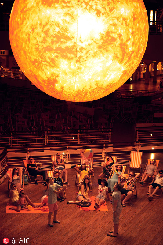 当地时间2018年9月18日,在英国曼切斯特特拉福德购物中心,顾客们在一个巨型的“太阳”下享受室内日光浴,感受英国未完的史上最热夏天。这个人造“太阳”的亮度相当于1.2万个灯泡。研究表明,五分之四的人在晴朗天气里会感觉到更幸福,Intu根据这项研究结果打造了这样一个人工“太阳”,希望能改善顾客们购物时的情绪。它将在未来一个月里在英国全国11个Intu购物中心展出。来源:东方IC