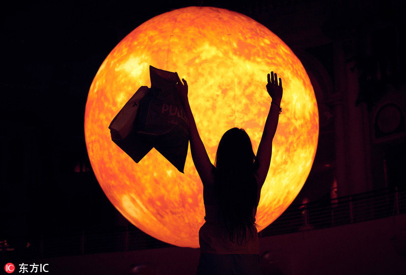 当地时间2018年9月18日,在英国曼切斯特特拉福德购物中心,顾客们在一个巨型的“太阳”下享受室内日光浴,感受英国未完的史上最热夏天。这个人造“太阳”的亮度相当于1.2万个灯泡。研究表明,五分之四的人在晴朗天气里会感觉到更幸福,Intu根据这项研究结果打造了这样一个人工“太阳”,希望能改善顾客们购物时的情绪。它将在未来一个月里在英国全国11个Intu购物中心展出。来源:东方IC