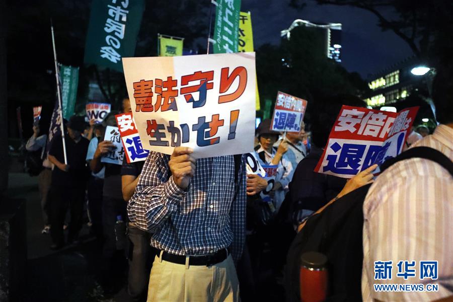 9月19日,在日本东京,一名民众手持标语参加游行。当日,近5000人在东京日比谷公园内参加反对新安保法集会。新华社记者 杜潇逸 摄