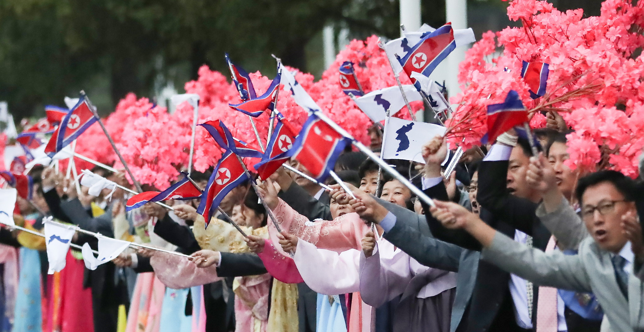 当地时间2018年9月20日,朝鲜平壤,在朝鲜三池渊机场,韩国总统文在寅结束访朝行程乘专机回国,金正恩夫妇机场送行。图片来源:东方IC