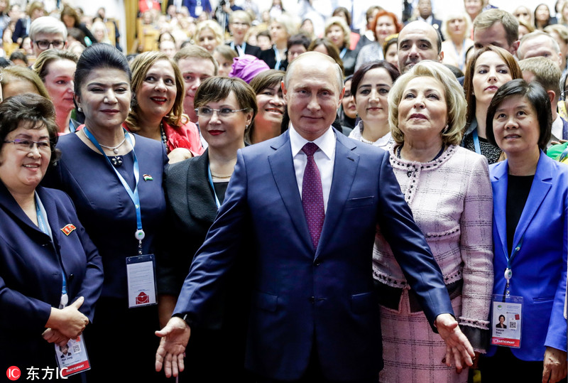 俄总统普京现身欧亚妇女论坛 被“迷妹”簇拥求合影