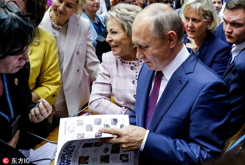 当地时间2018年9月20日,俄罗斯圣彼得堡,第二届欧亚妇女论坛在当地的塔夫利宫举行,俄罗斯总统普京现身论坛并发表讲话。图片来源:东方IC