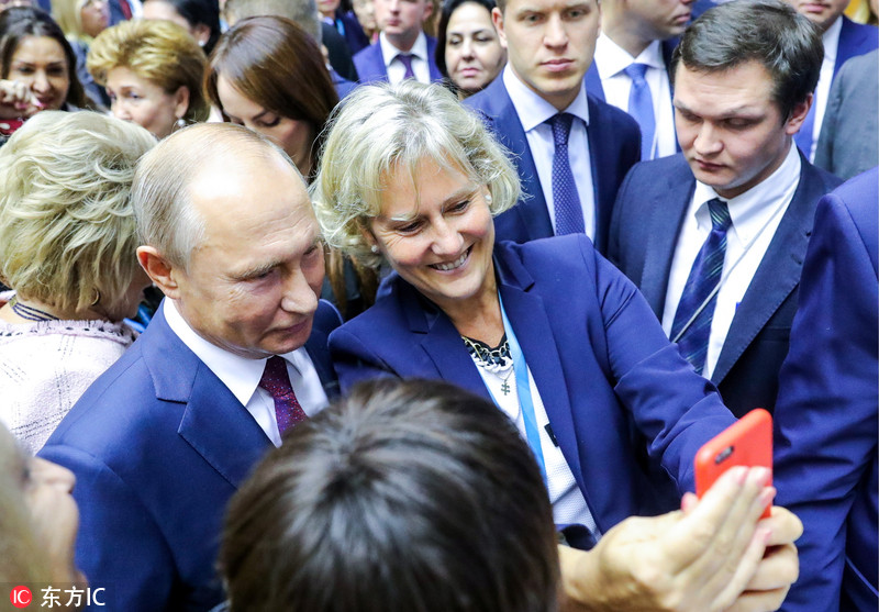 俄总统普京现身欧亚妇女论坛 被“迷妹”簇拥求合影