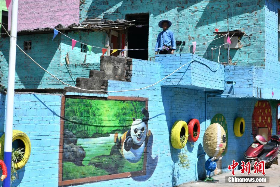 9月20日,河野村内普通的民房墙上彩绘色彩鲜艳。据了解,一个月前一个艺术家团队进驻村庄,在树上和墙上依据当地特色绘制了多幅彩绘,希望通过彩绘让河野村变得更美,吸引更多游客。中新社记者 任东 摄