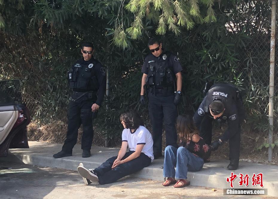 当地时间9月20日下午,美国加利福尼亚州大洛杉矶地区圣盖博市一座社区公园停车场内,圣盖博市警察局警官日瓦戈(图右一)与同事发现可疑车辆并搜出违禁毒品。图为警方逮捕一名女性嫌疑人。中新社记者 张朔 摄