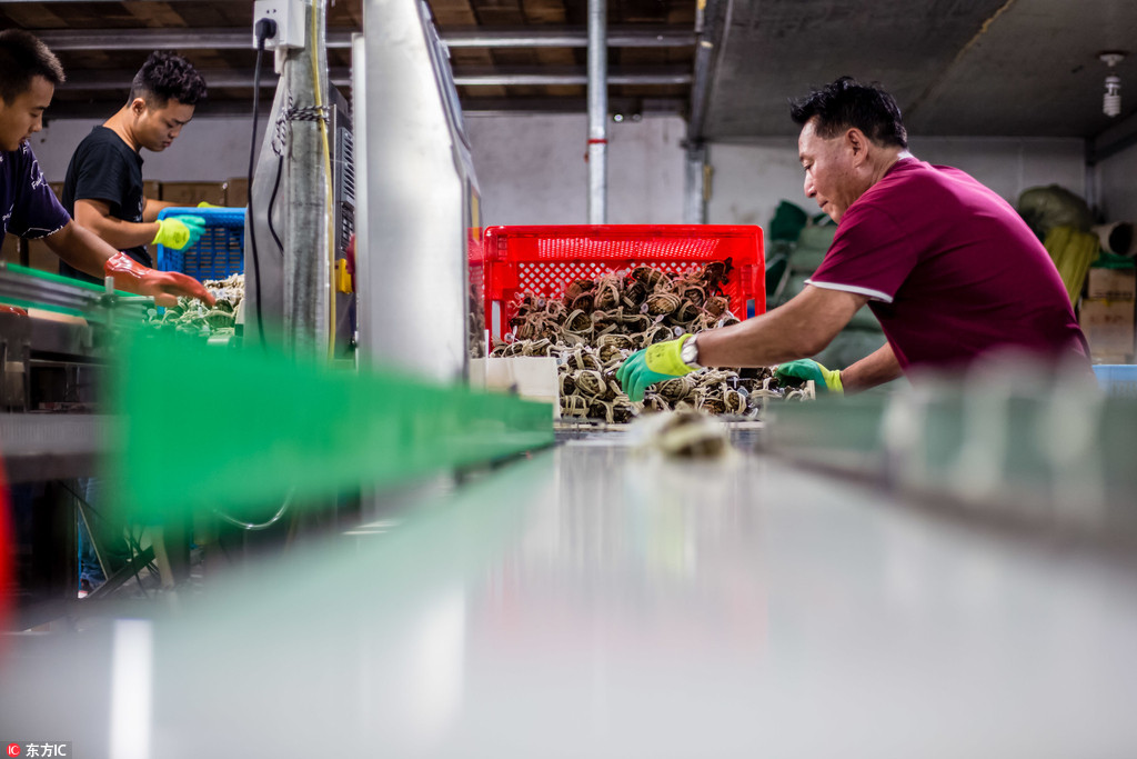 戴进元通过分选机给螃蟹自动称重分级,以往这项工作需要戴进元全手工操作。