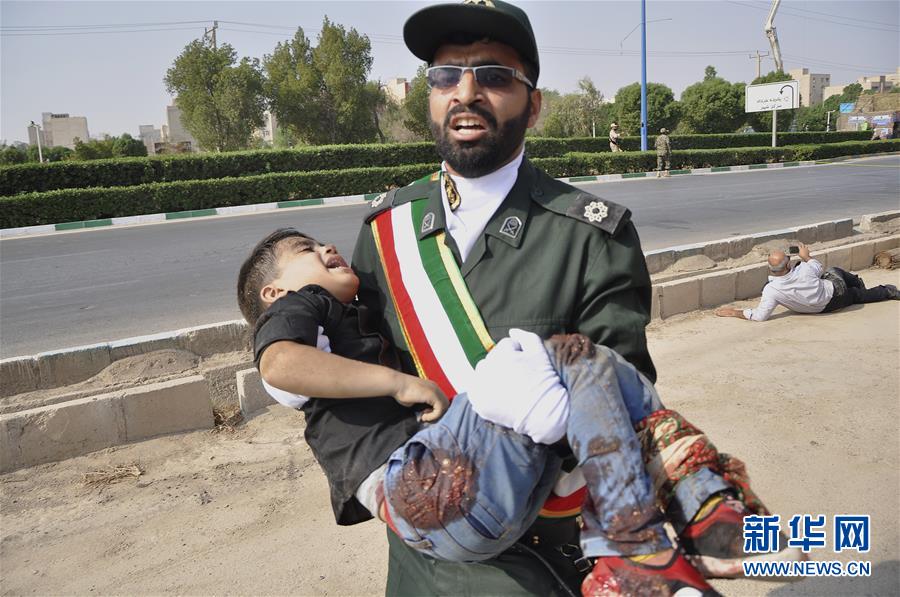 9月22日,在伊朗胡齐斯坦省首府阿瓦士,人们转移一名受伤士兵。 一伙武装人员22日在伊朗胡齐斯坦省首府阿瓦士举行的纪念两伊战争爆发38周年阅兵仪式上实施袭击,迄今已造成至少24人丧生、53人受伤。 新华社发