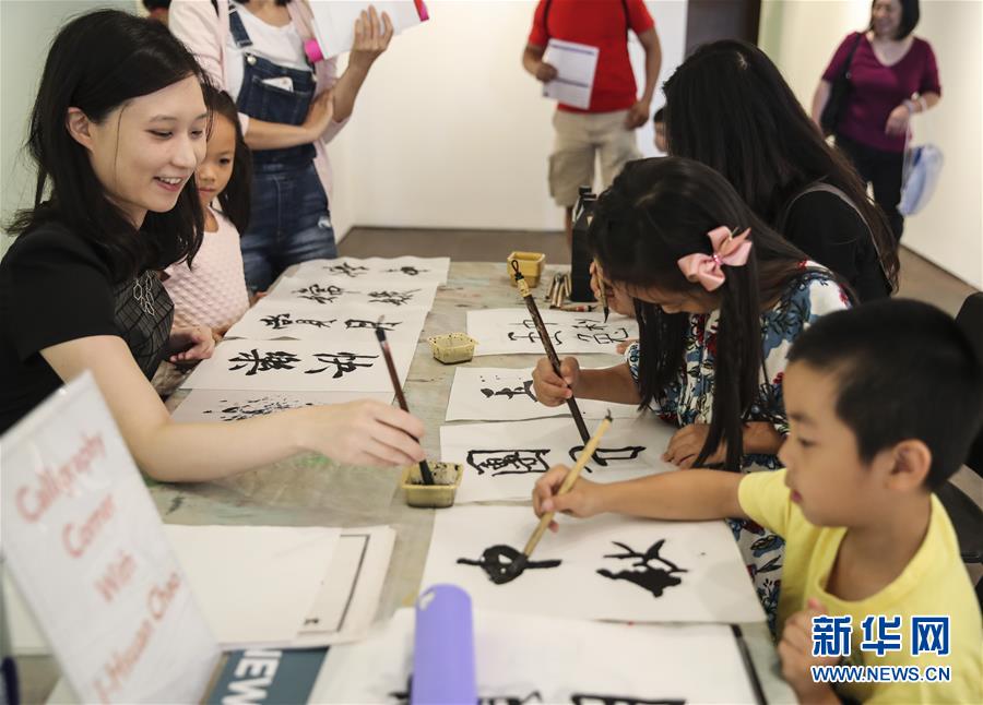 9月22日,在美国纽约华人博物馆,孩子们学写中国书法。 新华社记者王迎摄