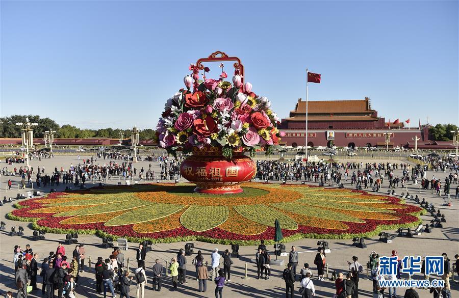 9月23日在北京天安门广场拍摄的“祝福祖国” 巨型花篮。当日,“祝福祖国”巨型花篮在北京天安门广场全面亮相。据了解,从2011年开始,“祝福祖国”巨型花篮一直作为天安门广场中心花坛的主景在国庆节期间向祖国献礼。今年花篮内布置有红掌、梅花、康乃馨、向日葵、兰花、月季等多种仿真花卉,寓意幸福吉祥。 新华社记者 李贺 摄