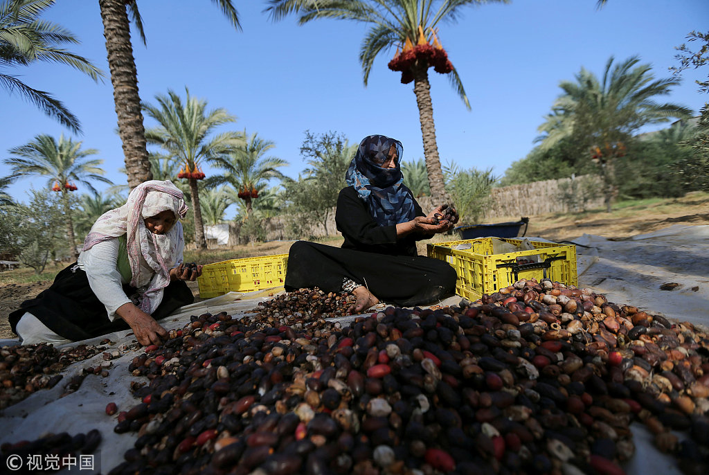 当地时间2018年9月23日,加沙地带Deir al-Balah,一名巴勒斯坦男子收割椰枣。
