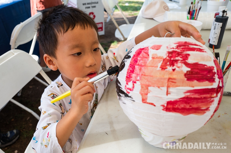9月22日,在美国洛杉矶,一名小朋友在“饕中秋美食节”上绘制灯笼。 当日,洛杉矶举行“饕中秋美食节”。除了美食,现场还有灯笼彩绘、武术表演等活动。人们聚在一起,迎接中秋佳节。