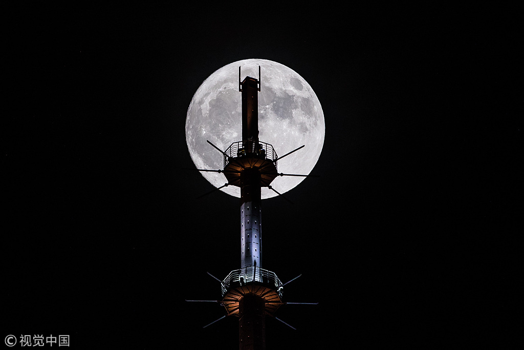 2018年9月24日中秋夜,广州塔塔尖挂起一轮圆月。