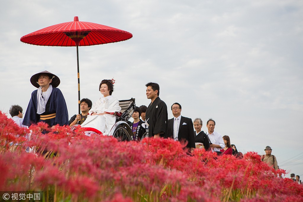 日本神社秋季盛典举行日式传统婚礼 新娘坐黄包车穿过花海