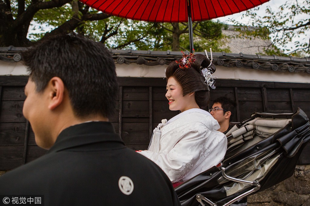 日本神社秋季盛典举行日式传统婚礼 新娘坐黄包车穿过花海