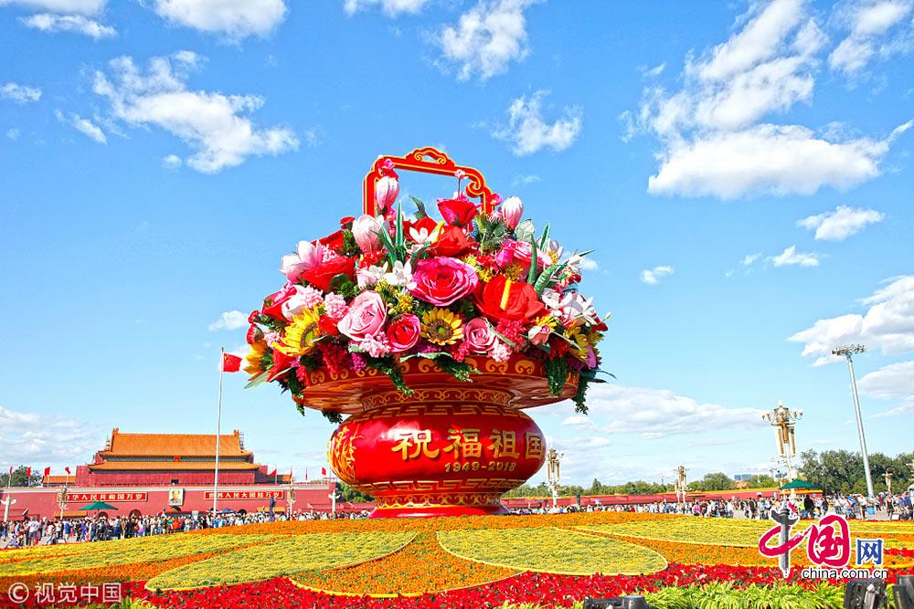 2018年9月24日,北京天安门广场“祝福祖国”巨型花篮全新亮相。赵乃明摄影
