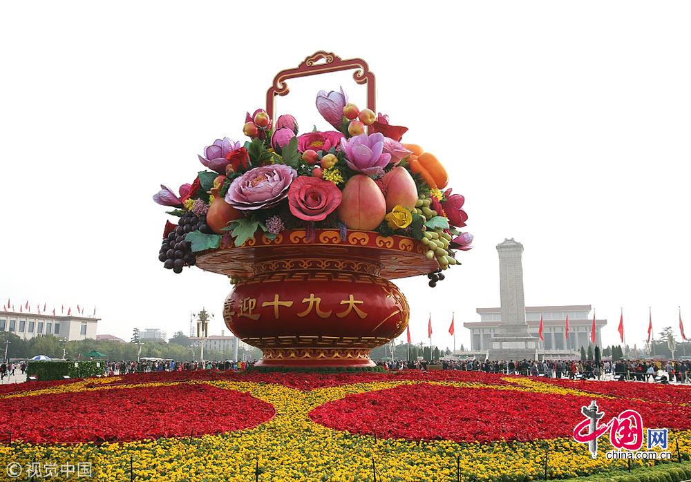 2017年天安门广场大花篮以喜庆的花果篮为主景,花篮顶高17米,篮体高15.3米,底部直径达50米。篮体南侧写有“祝福祖国、1949-2017”,北侧写有“喜迎十九大” 字样。花果篮内共使用主花56朵(牡丹、月季、玉兰、金桂、迎春花、苹果花、紫藤花、文心兰、叶子花),其中最大牡丹直径3.2米,果实6种(石榴、桃、柿子、苹果、海棠、葡萄)。寓意吉祥的果实和花卉,象征十八大以来,党和国家在各个领域取得的辉煌成就,硕果累累。底部花坛采用心形图案,寓意红心向党,象征着全国人民紧密团结在以习近平同志为核心的党中央周围,表达对祖国繁荣富强、欣欣向荣的美好祝福。