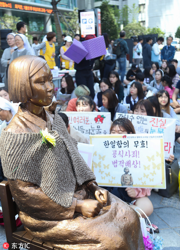 当地时间2018年9月26日,韩国首尔,当地民众在日本大使馆前举行第1354次例行集会,要求日本就慰安妇问题道歉。天气转凉,集会民众还贴心地为慰安妇少女像披上了针织衫。
