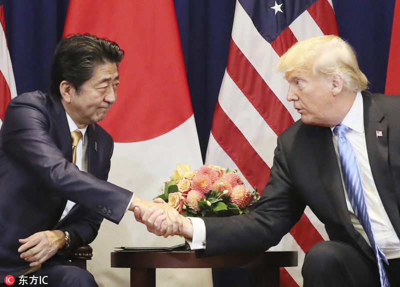 当地时间2018年9月26日,美国纽约,第73届联合国大会举行期间,美国总统特朗普与日本首相安倍晋三举行双边会谈。会谈期间,特朗普向安倍和媒体展示朝鲜最高领导人金正恩的信件。